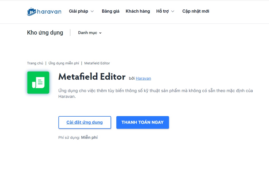 - Dùng Metafield Editor Haravan có bị mất phí không?