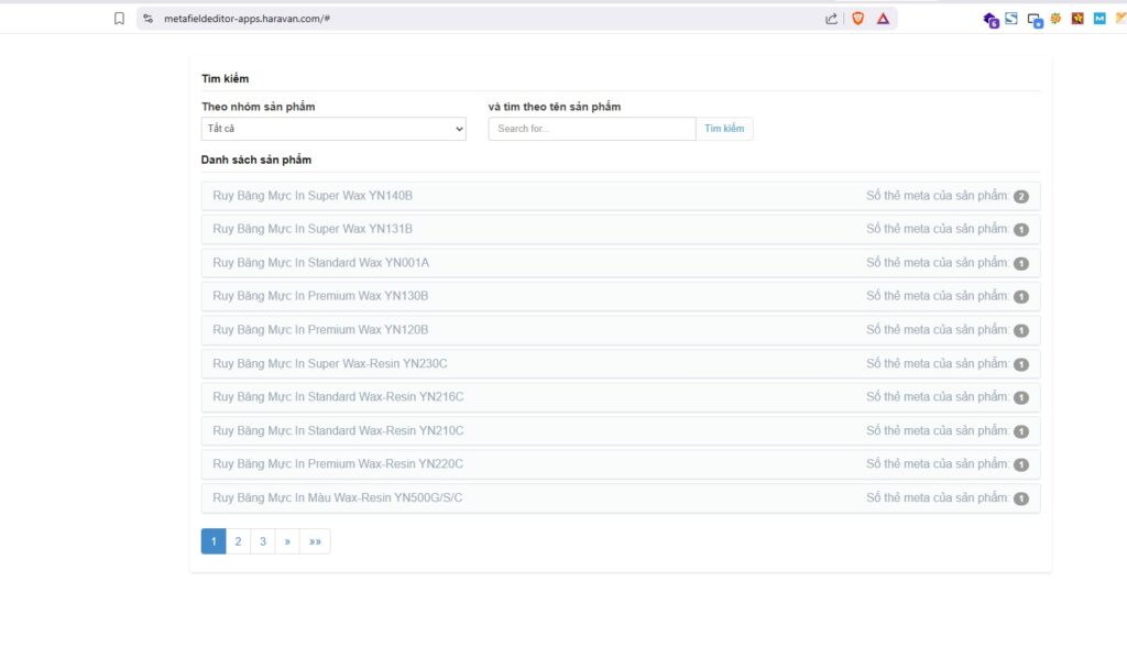 Trong giao diện ứng dụng, bạn sẽ thấy danh sách toàn bộ các sản phẩm trong kho. Sử dụng tính năng lọc hoặc ô tìm kiếm để xác định sản phẩm bạn muốn thực hiện cách thêm Metafield trong Haravan. Ấn trực tiếp vào tên sản phẩm đó để mở ra form khai báo thông tin kỹ thuật.