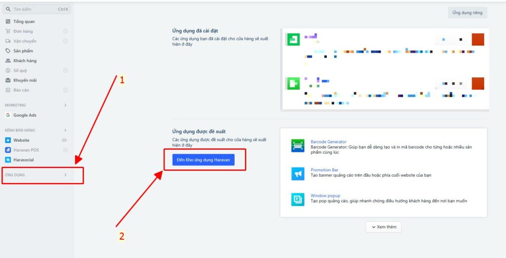 Tại thanh menu điều hướng nằm phía bên tay trái màn hình, bạn sẽ nhìn thấy mục “ỨNG DỤNG”. Click vào đây để mở ra kho lưu trữ các giải pháp giúp bạn tùy chỉnh sản phẩm Haravan một cách tự động hóa. Hãy chuẩn bị tâm thế để tiếp nhận công cụ mạnh mẽ nhất cho việc quản lý siêu dữ liệu.