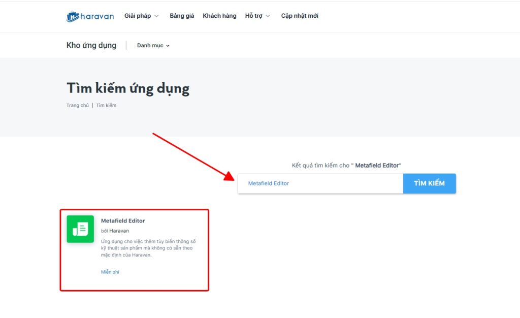 Sử dụng ô tìm kiếm phía trên cùng và gõ từ khóa “Metafield Editor”. Khi ứng dụng hiển thị trong kết quả, hãy chọn nó và nhấn nút “Cài đặt ứng dụng”. Đây là “chiếc chìa khóa” giúp bạn vượt qua mọi rào cản về việc thiếu hụt trường dữ liệu thông tin cơ bản của hệ thống. Đây là một công cụ miễn phí nhưng có sức mạnh vô song trong việc thiết kế website Haravan chuyên nghiệp.