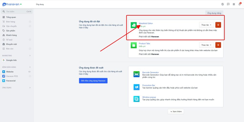 Sau khi hệ thống thông báo cài đặt hoàn tất, Metafield Editor Haravan sẽ nằm ngay trong danh sách các ứng dụng bạn đang sử dụng. Click vào tên ứng dụng để truy cập vào giao diện bảng điều khiển trung tâm – nơi mọi tùy chỉnh sản phẩm Haravan chuyên sâu được thiết lập.
