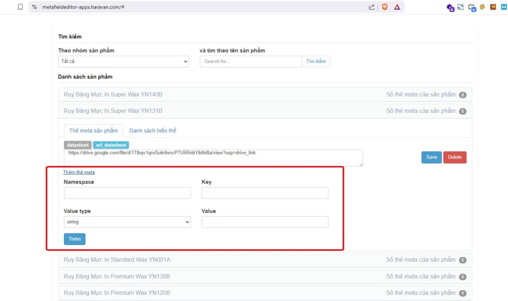 - Namespace: Có thể hiểu là “Nhóm”. Bạn nên đặt theo đặc tính của thông tin (ví dụ: `Thong-tin-ky-thuat` hoặc `download`). Điều này giúp phân loại dữ liệu khi bạn thực hiện cách thêm Metafield trong Haravan cho nhiều hạng mục khác nhau.