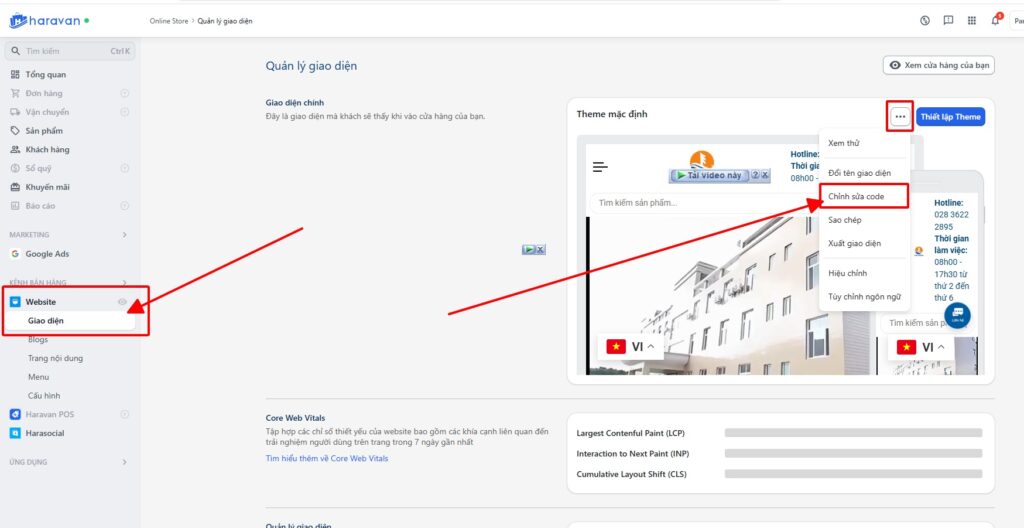 Sau khi lưu dữ liệu tại bước 7, thông tin vẫn chưa tự động hiện ra web. Bạn cần quay lại menu quản trị chính -> Chọn “Website” -> “Giao diện”. Click vào dấu ba chấm tại theme đang sử dụng và chọn “Chỉnh sửa code”. Đây là công việc đòi hỏi sự cẩn thận tối đa trong thiết kế website Haravan chuyên nghiệp năm 2026.