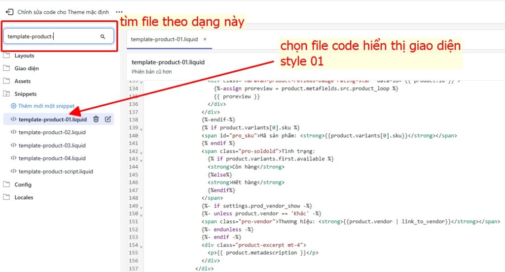 Mỗi giao diện theme sẽ có cách đặt tên file khác nhau. Thông thường, nó sẽ nằm trong mục `templates` hoặc `sections`. Hãy sử dụng thanh công cụ tìm kiếm bên trên cây thư mục để gõ từ khóa “template-product”. Nếu bạn dùng phiên bản giao diện số 01, file thường có tên là `template-product-01.liquid`. Việc xác định đúng tệp tin là yếu tố quan trọng để cách thêm Metafield trong Haravan hiển thị chính xác vị trí.