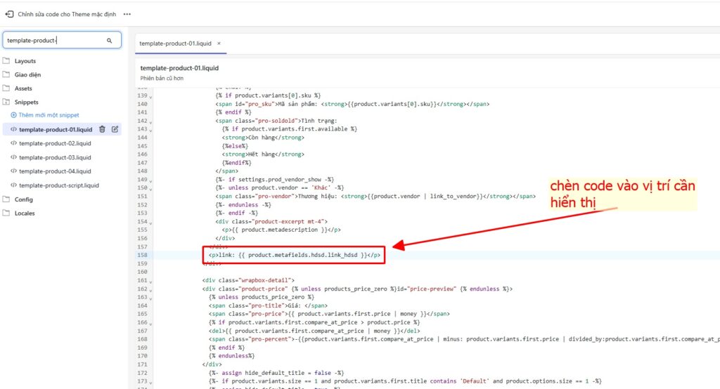 Bây giờ, hãy tìm vị trí trong code (thường là sau phần `product-description`) để add đoạn code hiển thị. Đây là bước quan trọng nhất của việc tùy chỉnh sản phẩm Haravan. Công thức chung như sau: