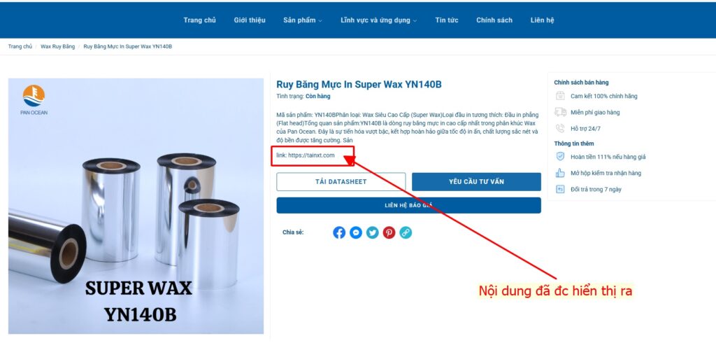 F5 (tải lại trang) ngoài cửa hàng chi tiết sản phẩm của bạn. Nếu bạn thấy giá trị mình nhập ở bước 7 hiển thị đúng chỗ, xin chúc mừng, bạn đã hoàn tất cách thêm Metafield trong Haravan thành công rực rỡ! Bây giờ bạn chỉ việc tinh chỉnh thêm bằng CSS để định dạng phông chữ, màu sắc cho phù hợp với phong cách thiết kế website Haravan chuyên nghiệp mà bạn đang theo đuổi.